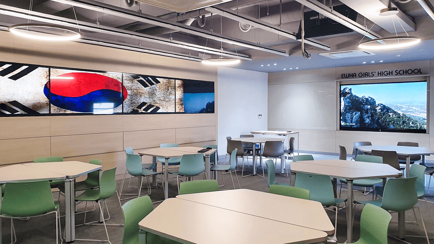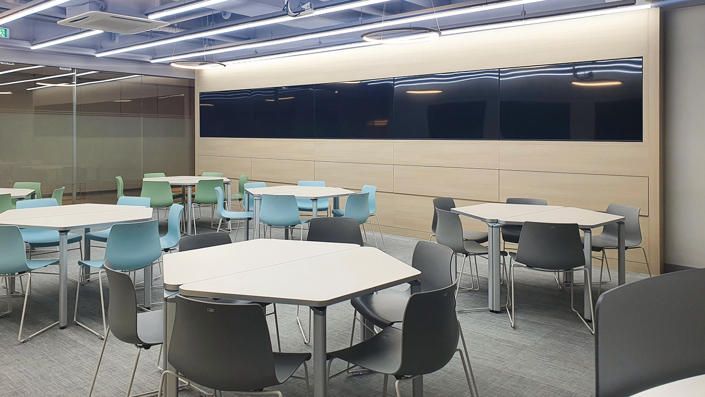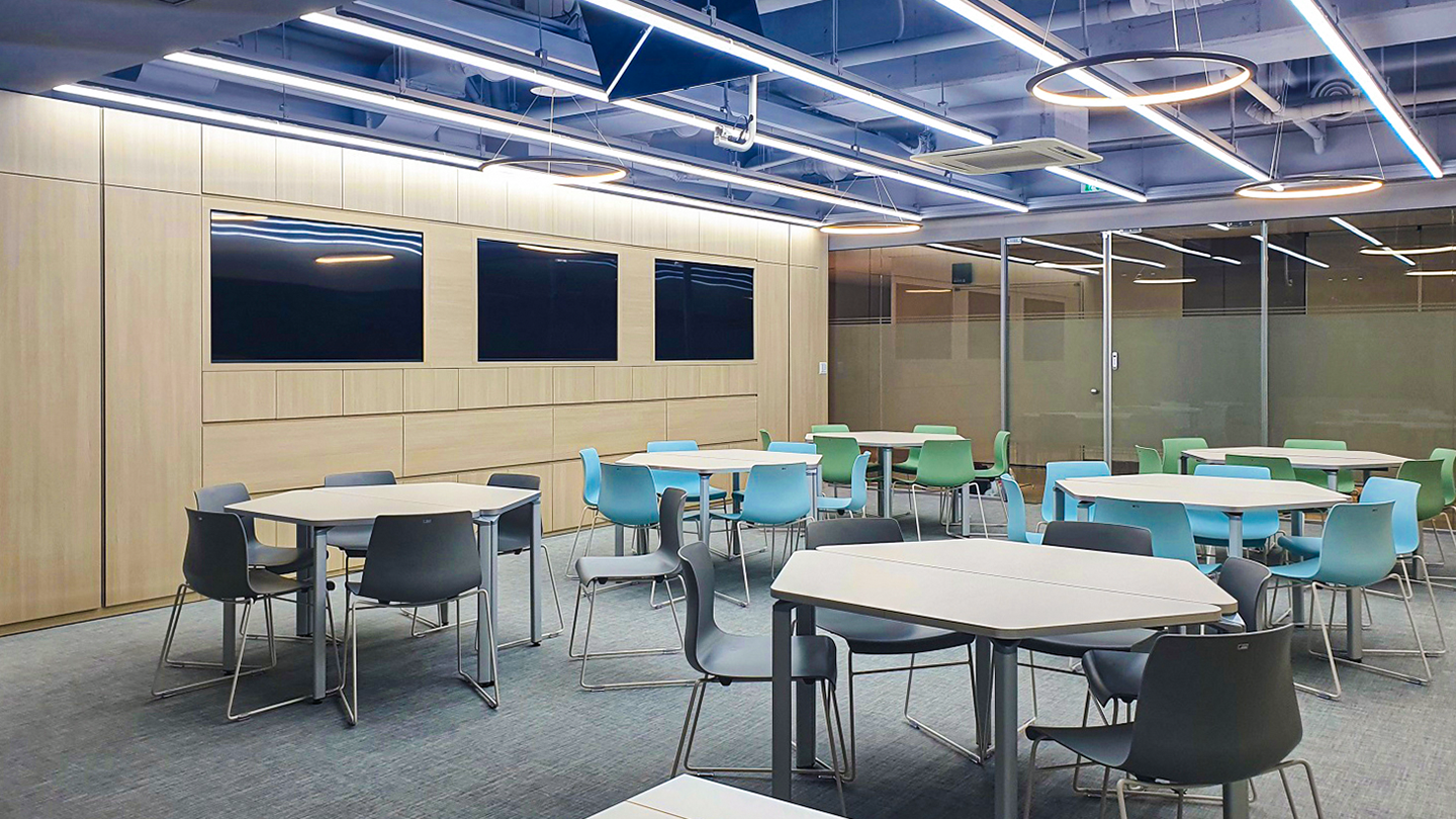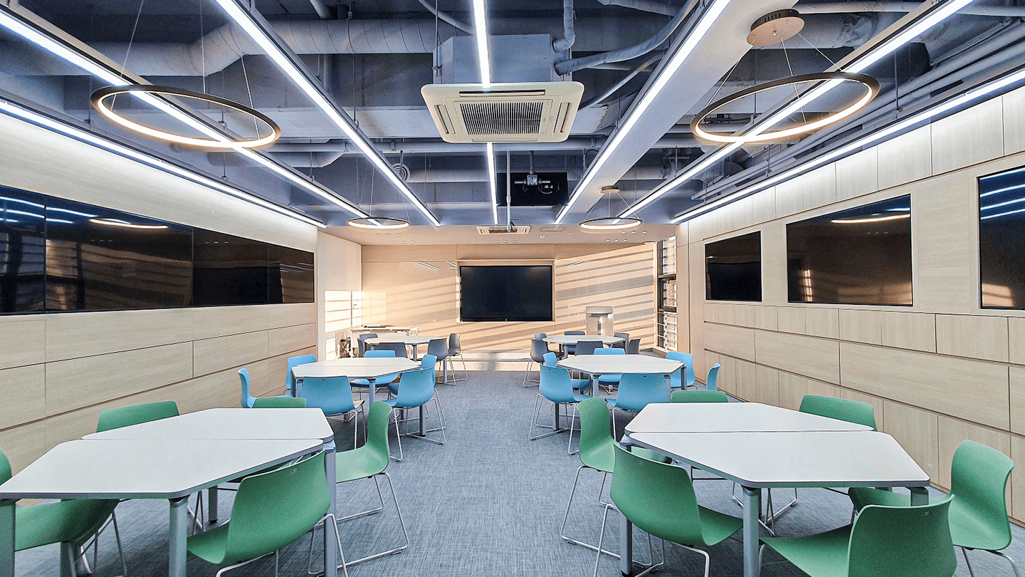노출 천장과 라운드 조명을 통해 트렌디한 학습 공간을 연출했으며, 전면 유리 파티션을 설치해 시각적 연결성과 소통 중심의 토론 환경을 조성했습니다.